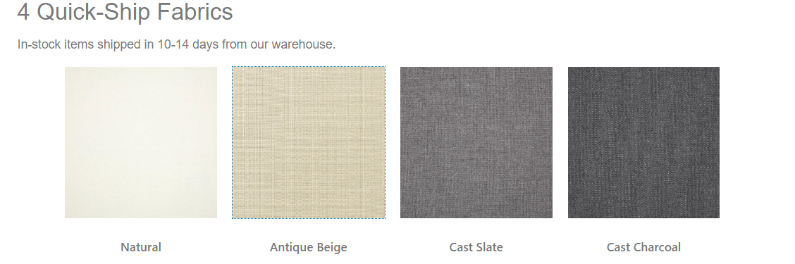 - 4 Quick-Ship Fabric Colors: Natural White | Antique Beige | Cast Slate | Cast Charcoal