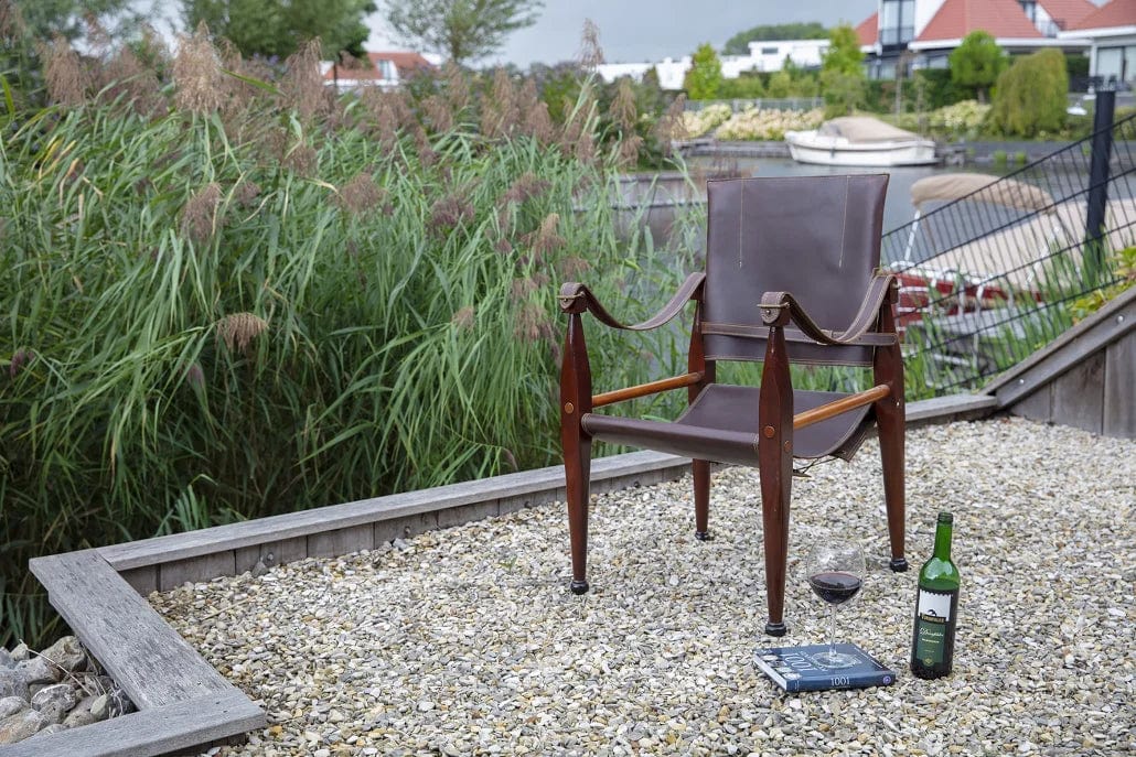 Gently worn, patina'd leather. Honey-finished solid wood assembly frame. Originally designed by London Army & Navy purveyors for Imperial Army officers on the move. Legs and frame rolled up inside the canvas seat, or if luxury was called for, leather. Then in the 1920s taken by European settlers of the Argentina pampas, it became the gaucho's stock for trade. Aged ones now populate living rooms of haciendas in Argentina and Uruguay. Designed to function on uneven footing, their flexibility surprises. Guess being on a horse all day made gauchos appreciate the gentle movement of this truly magical chair with a macho provenance.
