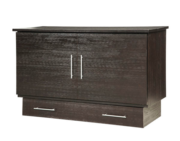 The original style Creden-ZzZ cabinet bed! Features a dark roasted brown finish on Poplar veneer with brushed aluminum bar hardware gives this queen-sized cabinet bed a clean contemporary look that’s perfect for home offices, urban lofts, or blending with any transitional decor. The new Flip Top Creden-ZzZ style cabinet bed gives sleepers more headroom while keeping a low, easy to-use top surface. Simply slide items to the back to flip open the top. Latches and safety chain are hidden inside for a clean exterior. The solid sleeping platform makes a comfortable bed — no springs, no rolling to the middle, and no “bar-in-your-back.”