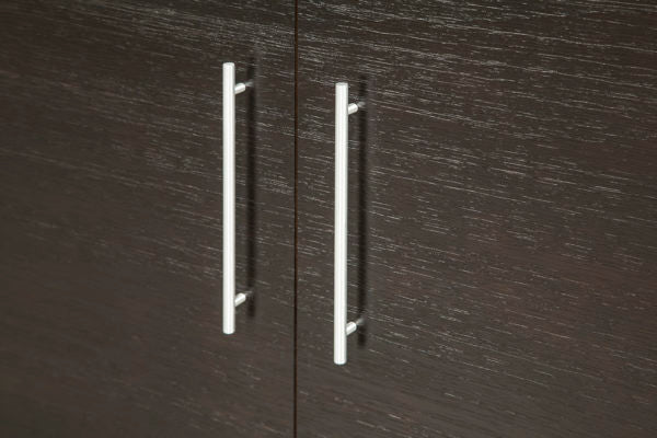 - Warm, dark-roasted espresso, brushed finish on poplar veneer with 9.5″ brushed aluminum hardware