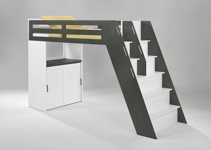 This Galaxy loft bunk is out of this world. Featuring a folding twin bed with mattress underneath, and a drop down desk under a wide staircase. Sixteen color comnbinations are possible by mixing different Rails and Panels boxes.
