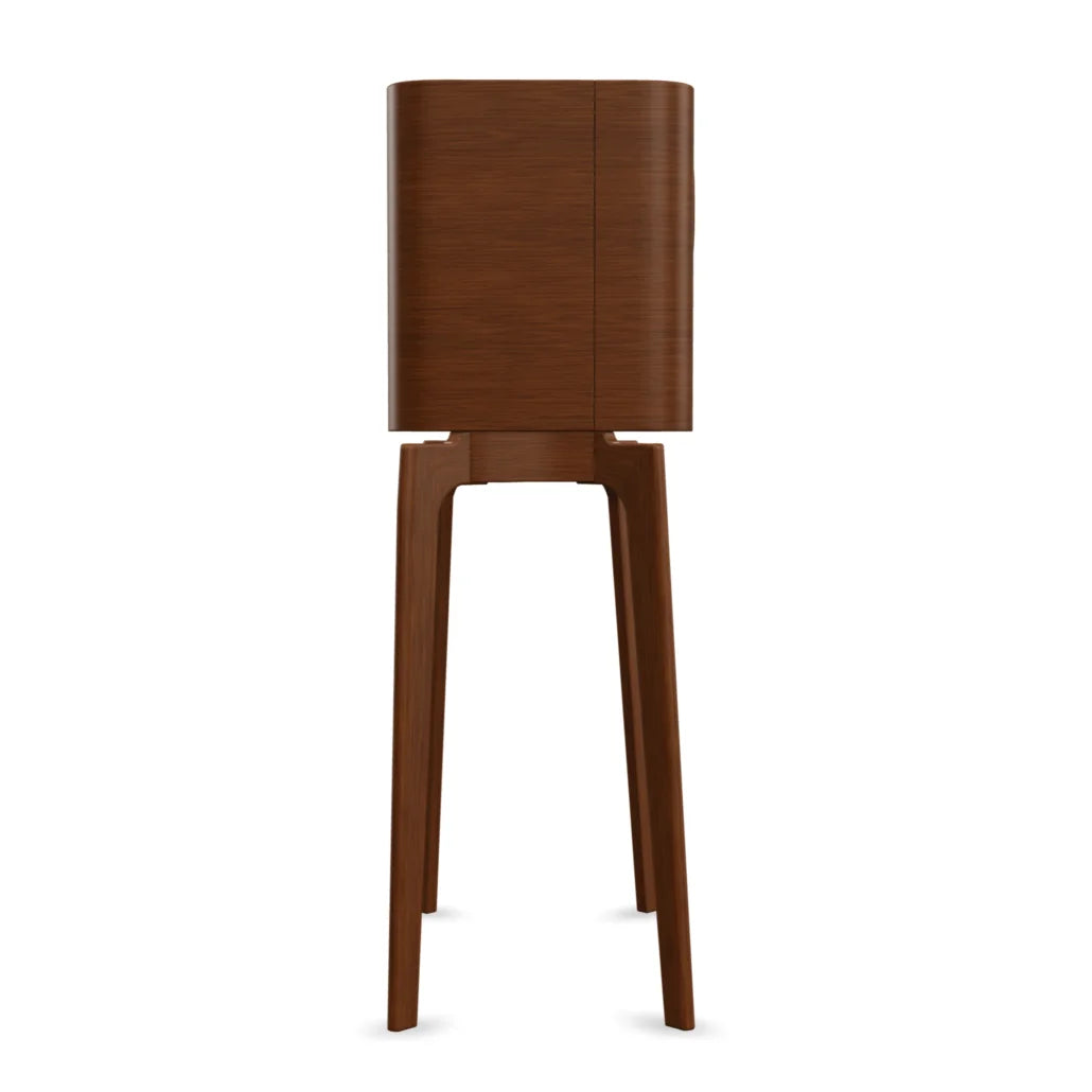 This attractive bar cabinet delivers classic elegance in nicely finished wood with our distinctive mid-century features. When it opens, there is a lot of space for storing your bottles and glasses. It even has a hidden mirror inside. It will be the eye catch of the room for sure.